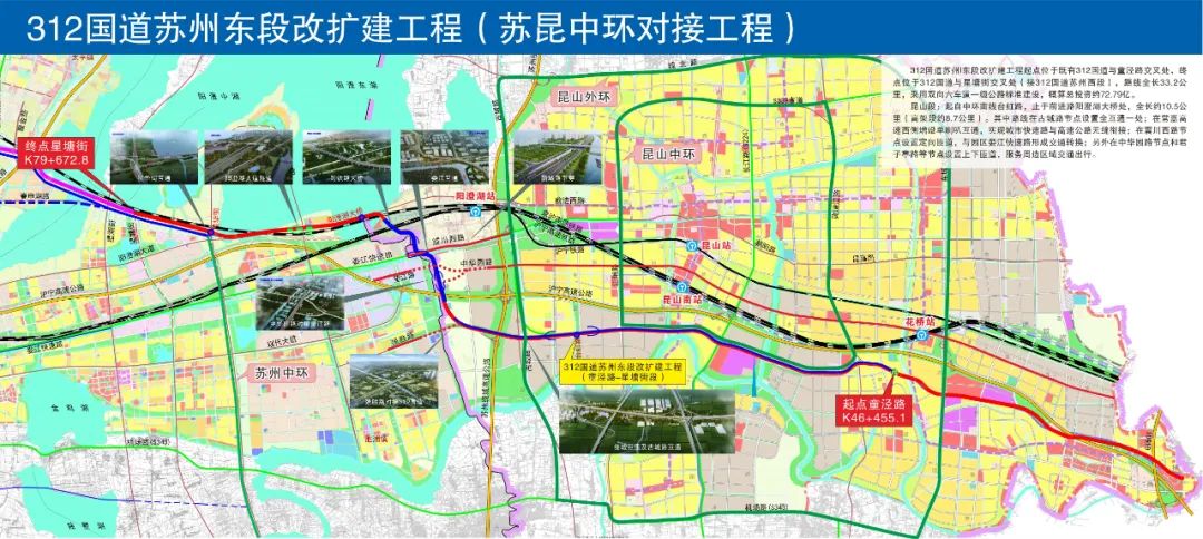 312国道苏州东段改扩建工程全长33.2公里,全线采用双向六车道一级公路标准建设。其中,昆山段全长约10.5公里,总投资约53.4亿元。