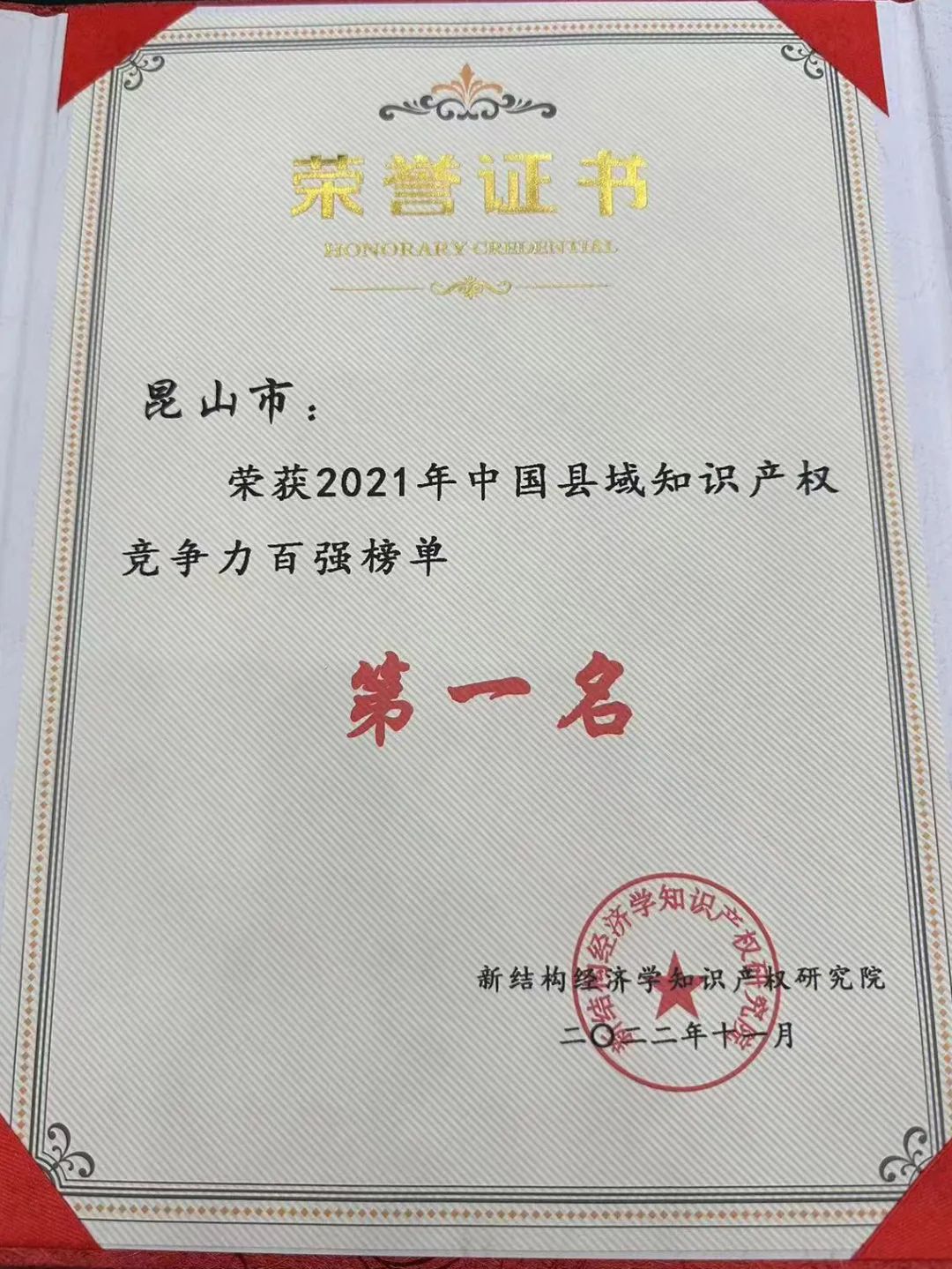 2021年,昆山市获评首批江苏省知识产权保护示范区;昆山市在知识产权创造、运用、保护、管理和服务等方面成效明显获省政府督查激励。全市新增专利授权40517件、其中发明2183件(增幅34.67%),商标注册15707件;新增PCT国际专利申请330件;新增马德里商标国际注册11件;高价值发明专利5386件、万人高价值发明专利拥有量25.74件。获批中国专利奖6项,累计43项;获批省知识产权战略推进计划5项、苏州优秀专利奖(杰出发明人)5项、苏州市级知识产权项目16项。
