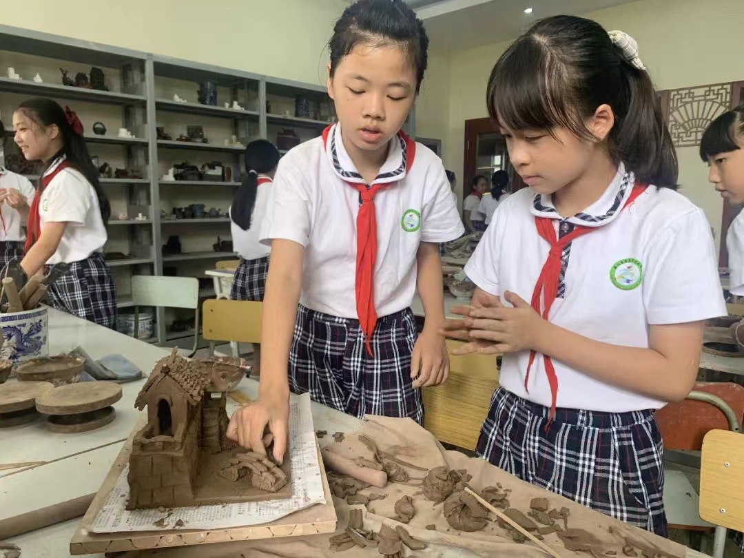 另外,学校依托陶艺教室,以周庄古镇为主题开展相关活动。“我们把‘中国第一水乡’作为创作主题,不断增进孩子们对故乡的情感。”张秋月介绍道,在这一思路带领下,基础班和提高班的孩子们在掌握了基础创作方法的基础上,从身边寻找素材,创作出《古戏台》《灶台》《房子》《院子》《水车》等优秀陶艺作品,粉墙黛瓦、栩栩如生。