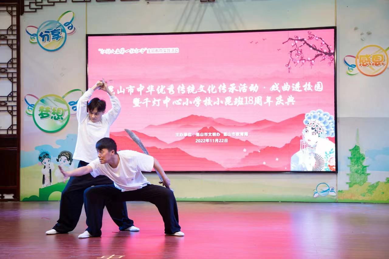 11月22日,传承中华优秀传统文化·戏曲进校园暨千灯小学校小昆班18周年庆典举行。上海昆剧团昆曲老师以及昆山黄国杰、顾建明、何建华三位资深昆曲老师应邀前来为千灯中心小学的学生传授技艺。