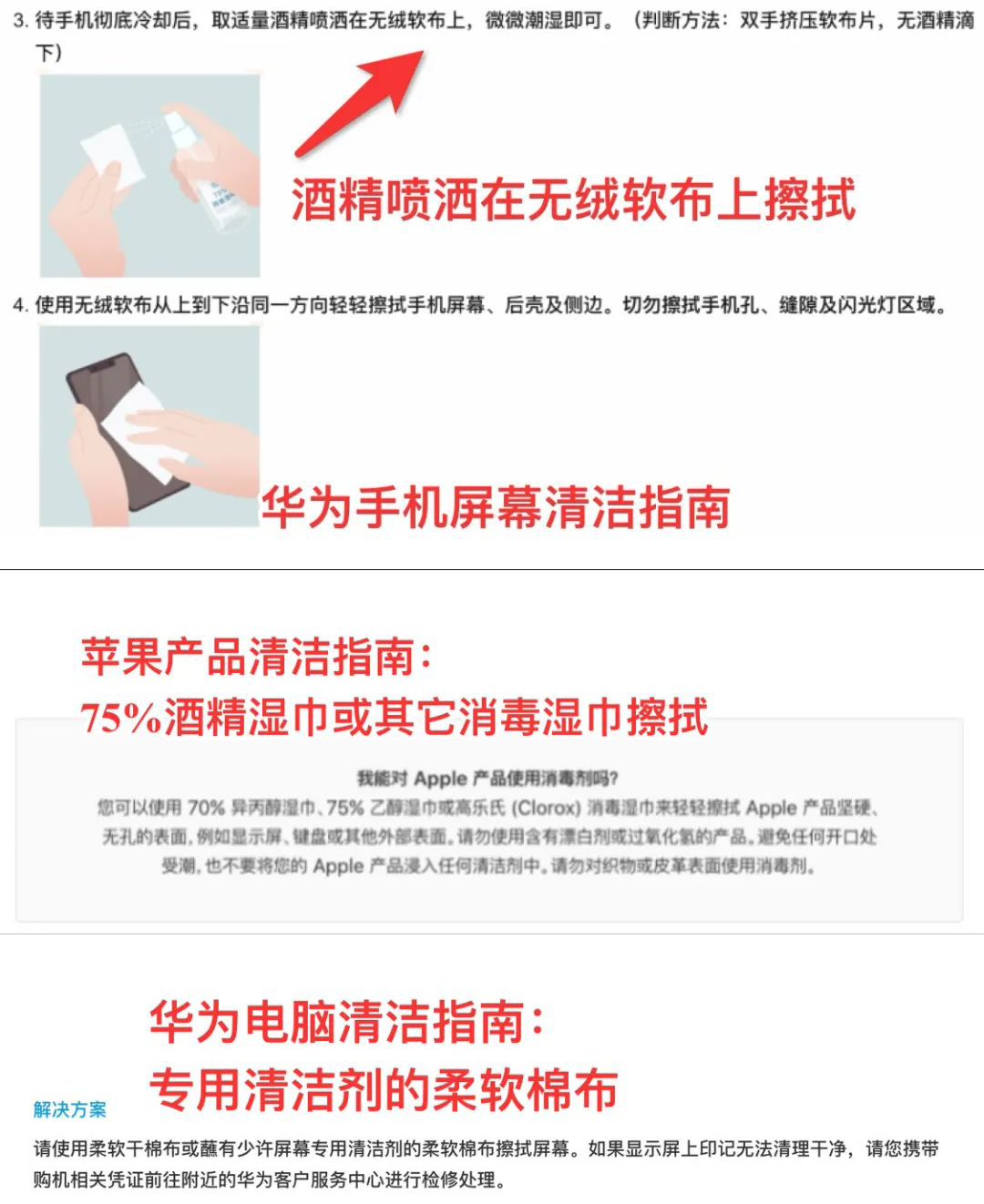 ②部分电脑、电视、平板的屏幕表面有“抗反射涂层”,不可以用酒精擦拭,只能用屏幕专用清洁剂。记得查看一下产品官方出具的清洁指南(比如下面这种)。