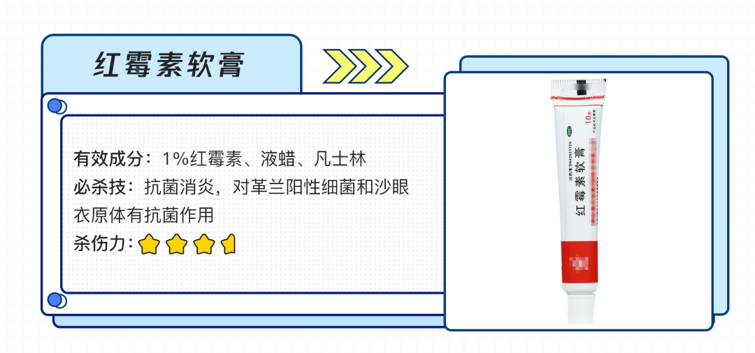 比如身上长了脓包、化脓了;轻微划伤,清洗消毒后;做饭的时候小面积的烧伤、烫伤,先用冷水冲洗一下,都可以涂点红霉素。