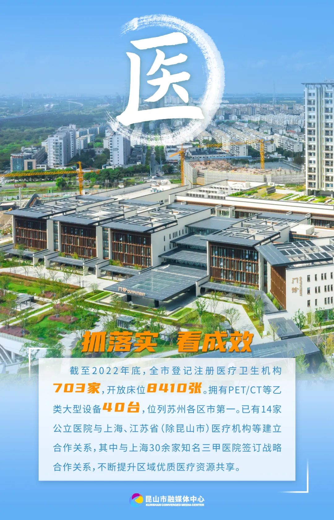 西部医疗中心已经正式启用,东部医疗中心已具备搬迁条件,昆山市康复医院创成全国县域首家三级康复医院,昆山市精神卫生中心增挂昆山市心理健康中心牌子。截至2022年底,全市登记注册医疗卫生机构703家,开放床位8410张。拥有PET/CT等乙类大型设备40台,位列苏州各区市第一。