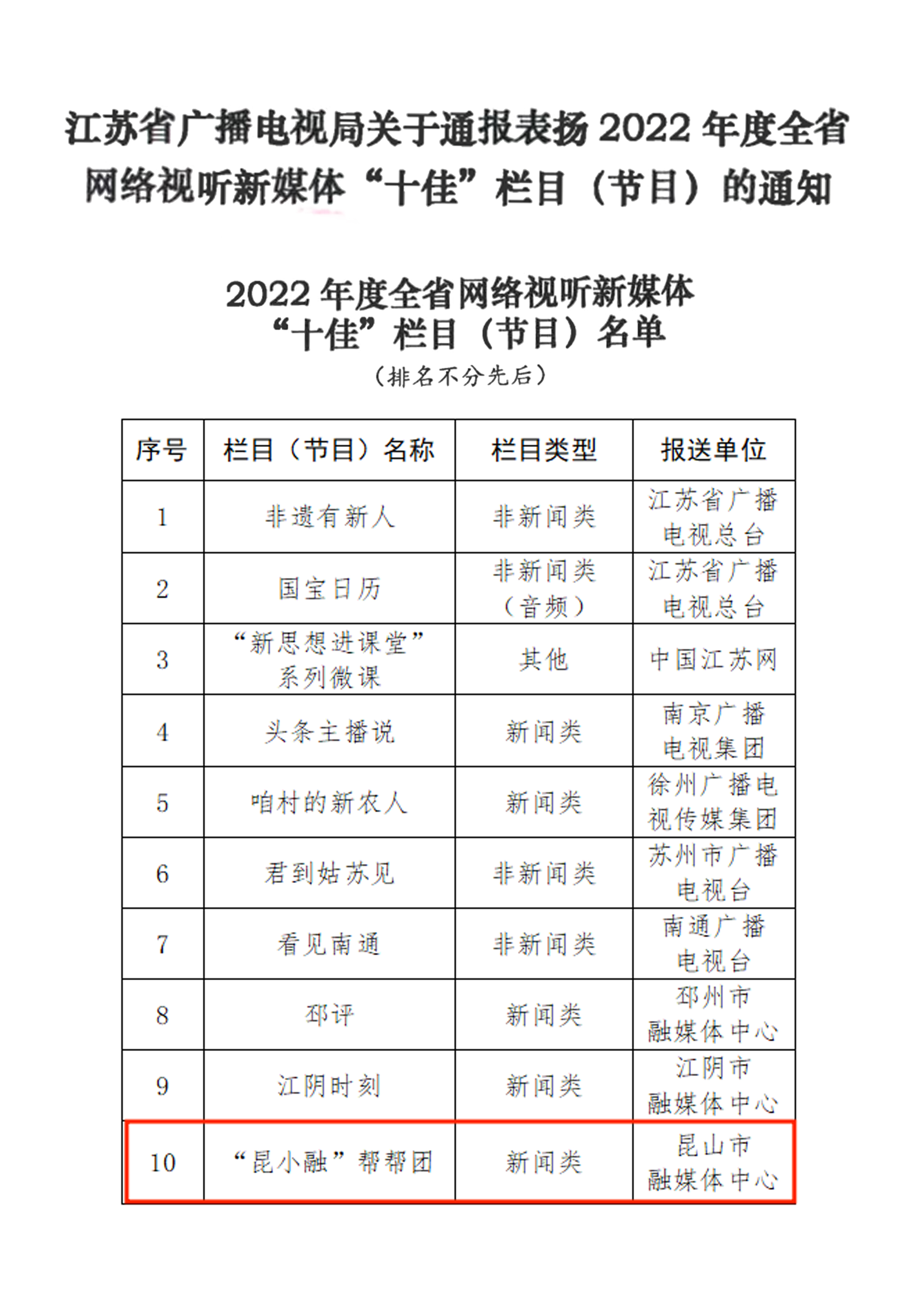 2022年度全省网络视听新媒体“十佳”栏目(节目)推选活动评选工作日前结束,昆山市融媒体中心策划推出的《“昆小融”帮帮团》栏目榜上有名。这也是继2020年《VLOG我眼中的小康》后,昆山市融媒体中心第二次获得该奖项。