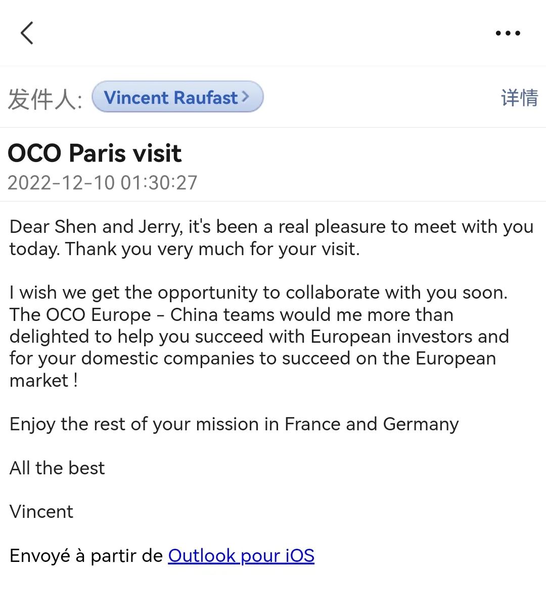 “很高兴今天能见到你们,我们希望能够有机会合作,OCO集团、欧洲及中国团队非常乐意帮助你们在欧洲企业招引方面取得成功,并帮助中国企业在欧洲市场取得成功。”12月9日,昆山商务局小分队在法国巴黎拜访OCO法国总部后,一封感谢的邮件随之而来。