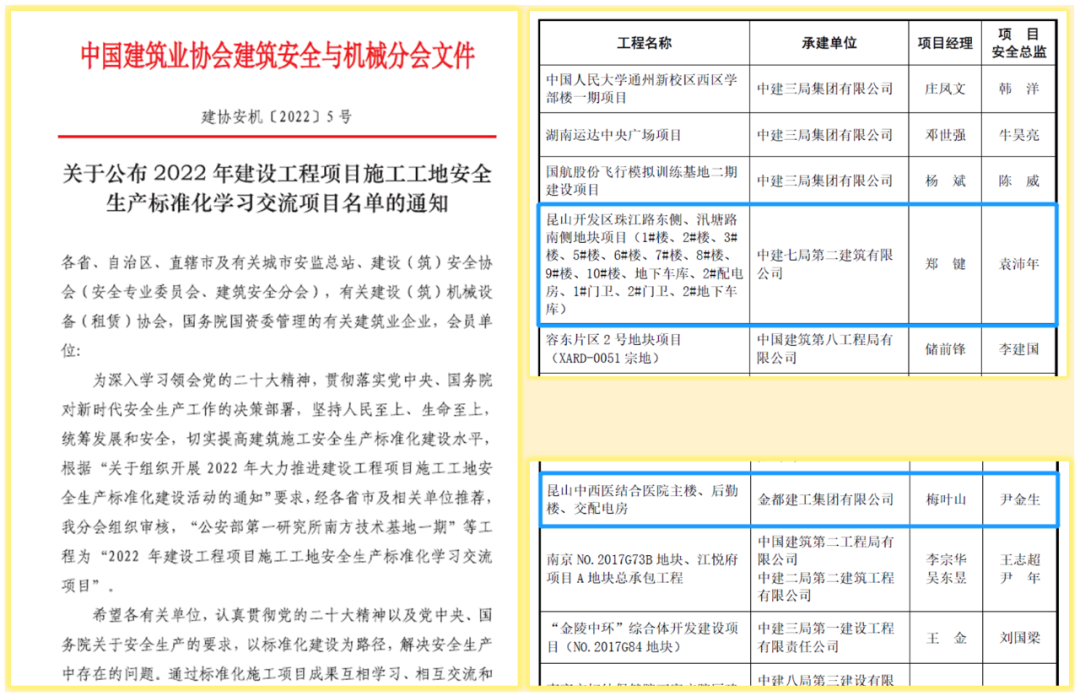 近日,中国建筑业协会建筑安全与机械分会印发通知,公布全国“2022年建设工程项目施工工地安全生产标准化学习交流项目名单”,中建七局第二建筑有限公司承建的昆山开发区珠江路地块项目,金都建工集团有限公司承建的昆山中西医结合医院项目跻身该榜单。