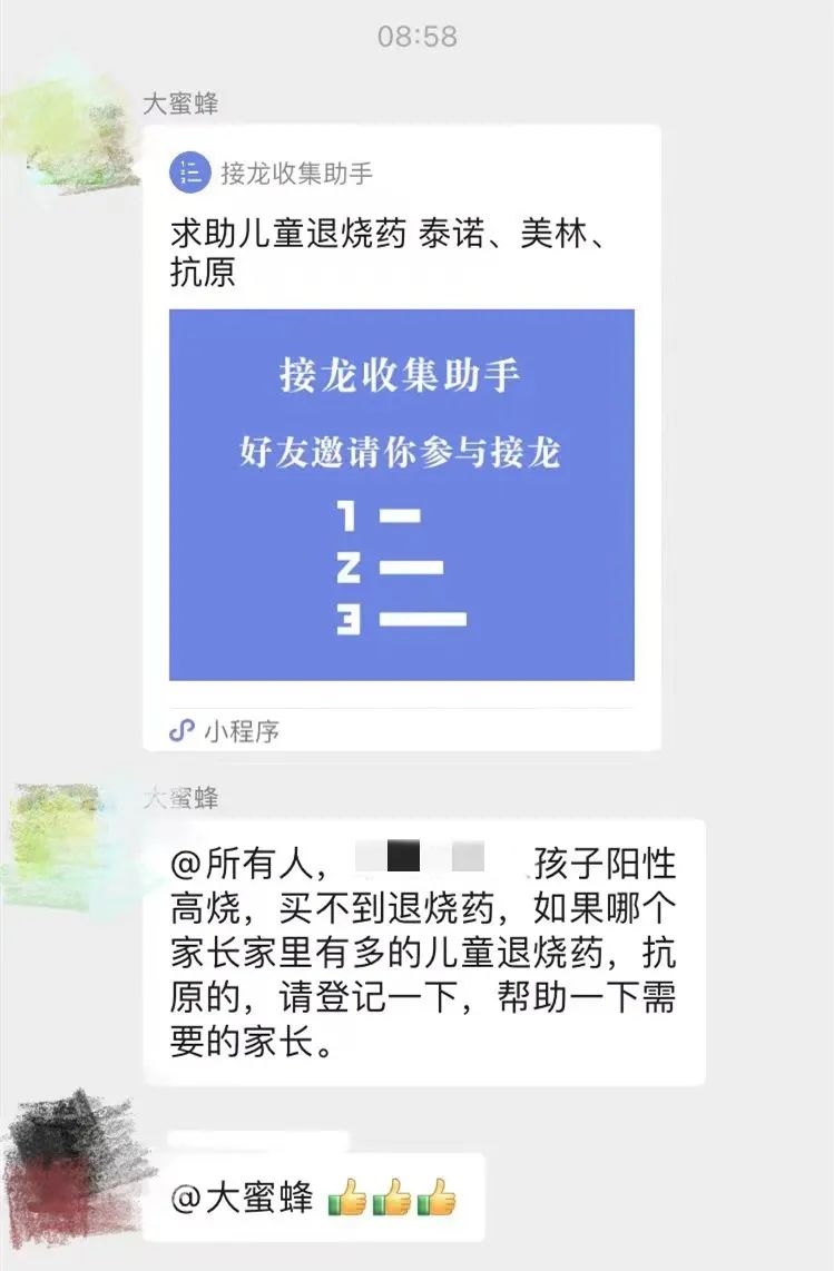 另一位网名为“成成”的群友说:“孩子生病,最着急的一定是父母。我特别能体会到那些手头缺药的父母的心情。自己的药一时半会还用不上,当然是先给有需要的人。”“成成”向一名发高烧的孩子送出了一瓶美林,她觉得主要是靠群主“大蜜蜂”让群友们手里有限的医疗资源得到了高效对接。