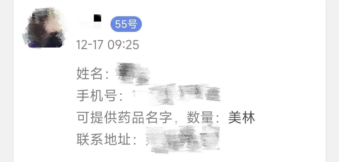 接龙的起因要从12月15日说起,当天,王女士和孩子开始咳嗽,并伴有发热症状。家中虽然提前备了药,唯独儿童专用退烧药布洛芬混悬液(美林)一直没有买到。12月17日上午,王女士孩子的体温已超过39℃。她心急如焚,抱着试一试的想法联络了一位接龙里登记的群友。