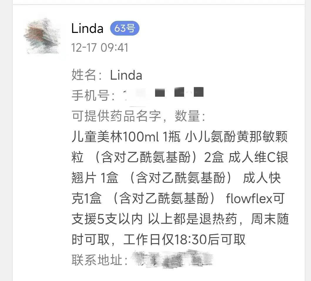 “儿童美林100ml一瓶、小儿氨酚黄那敏颗粒(含对乙酰氨基酚)2盒、成人维C银翘片1盒(含对乙酰氨基酚)、成人快克1盒(含对乙酰氨基酚)......”在登记信息中,就数“Linda”填写得最详细,药品种类也最丰富。她在上周末跑了好几家药店才备齐清单上的药品,却在看到这条征集药品的群消息时,马上决定将手里仅有的两瓶美林送出一瓶。