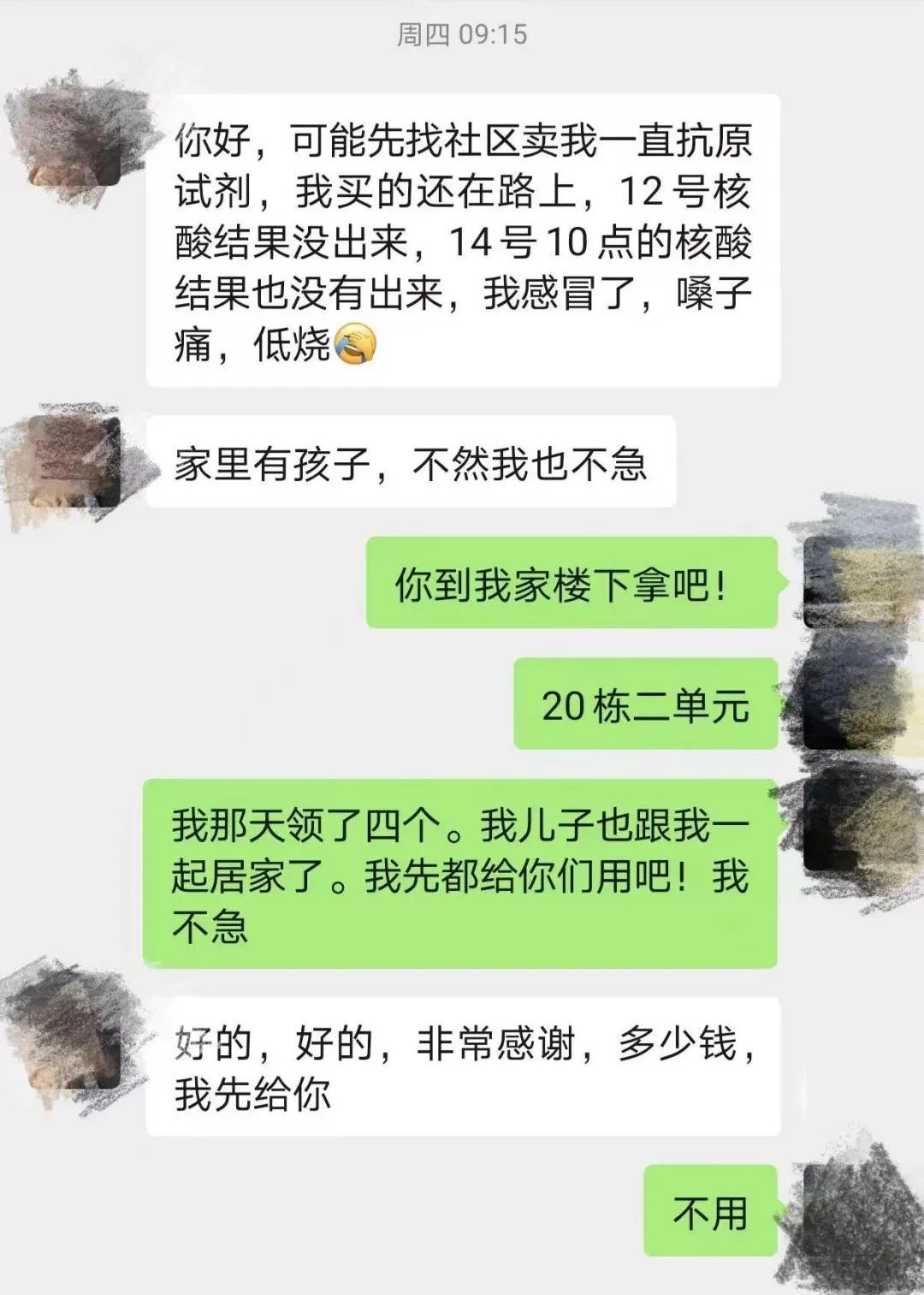“帮忙谈不上,太小的事了。”网名为“桃之夭夭”的群友说。她有一盒多余的泰诺,随手在群里登记了,很快就有快递员来取走送到了需要的人手里。“爱出者爱返,福往者福来。我们家今晚的菜还是热心邻居送来的呢。”这位热心群友告诉小昆:“非常时期互相帮助是应该的,我希望大家都好,早日挺过去。”
