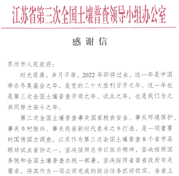 近日,昆山市农业农村局意外接到了一份来自江苏省第三次全国土壤普查领导小组办公室热情洋溢的感谢信。感谢信通过苏州市人民政府转送,信中对昆山市在三普工作中的探索实践、工作成绩给予了充分肯定,称赞我市三普工作为全省普查工作试点及全面推进提供了很好的借鉴。