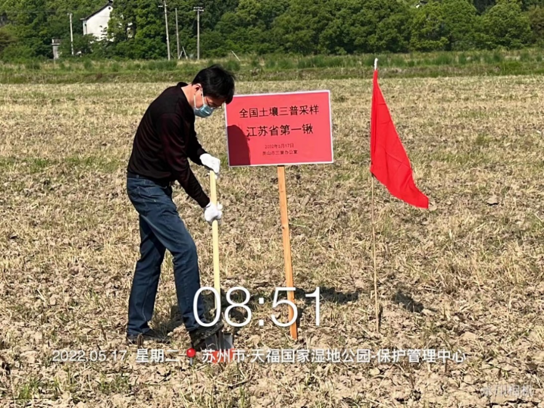 ▲2022年5月17日,昆山市三普办工作人员在国家布设全国普查76号点位(位于花桥经济开发区天福国家湿地公园),铲下了土壤三普的“全国第一锹”