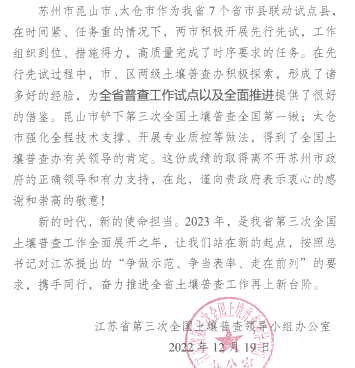 感谢信来“点赞”!昆山土壤三普工作获省级表扬