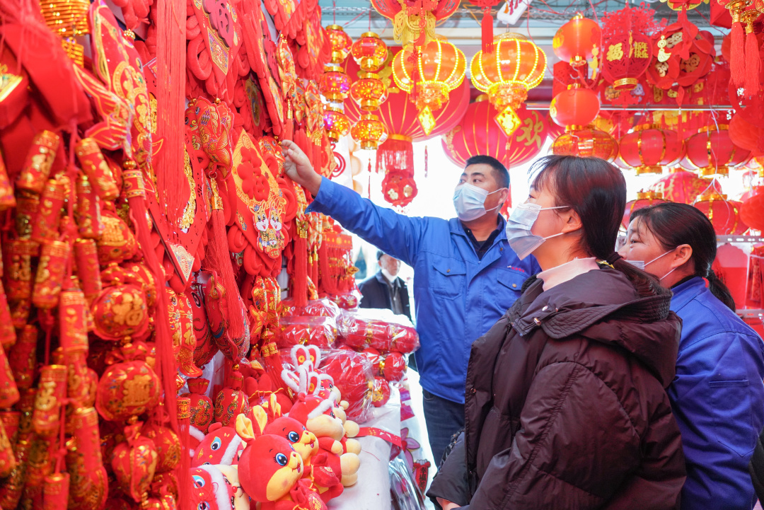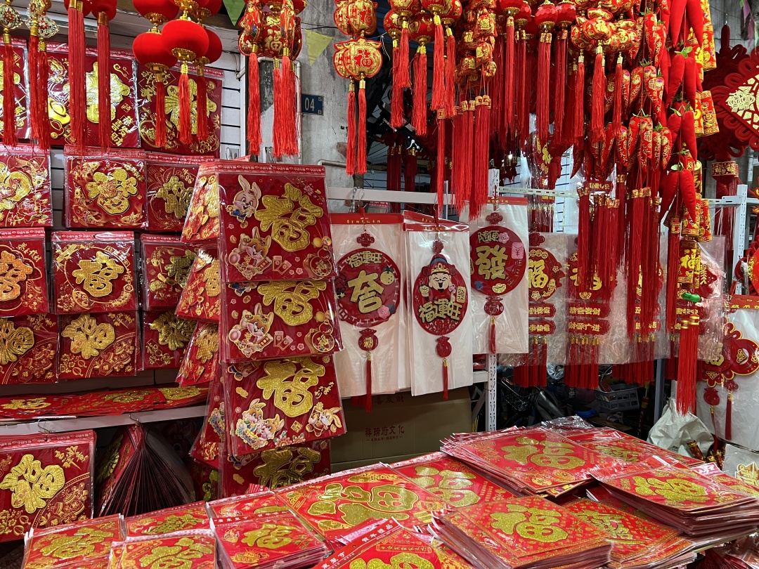 这个几天生意蛮好的,像春联、福包都卖得很好,今年上新的有中国结、兔子灯,样子好看,款式也是非常多,特别受欢迎。