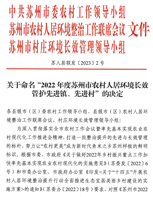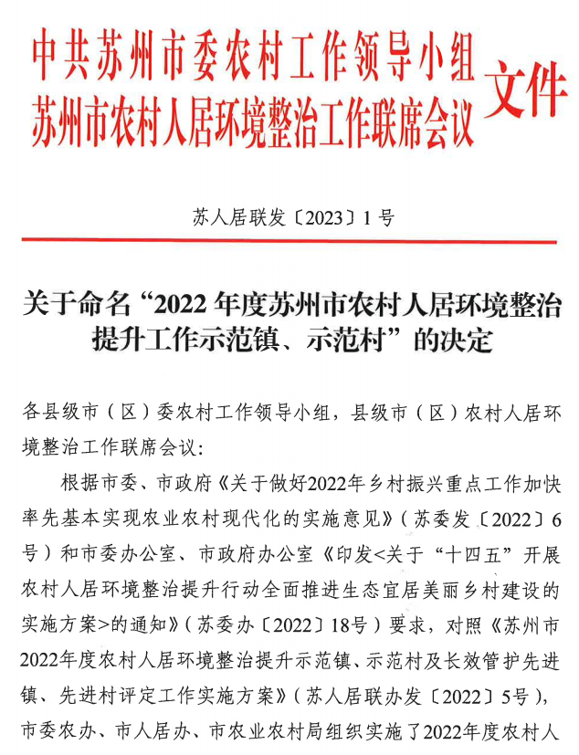 2022年,我市统筹谋划“十四五”农村人居环境整治提升工作,坚持从“全面、全域、全力、全民”四个维度出发,以“四季战役”“帮扶转化”等方式对农村人居环境整治工作进行再部署、再动员、再落实,农村人居环境整治取得显著成效,获评“四好农村路”全国示范县,“红黑榜”制度被纳入国家农村人居环境整治五年行动方案,全市累计创建一星户美丽庭院2万余户,占可创建总户数的62.2%,新评定五星户美丽庭院753户。昆山被列入全省首批农村人居环境整治提升示范县培育计划,1镇、9村列入省级农村人居环境整治提升示范镇村培育计划,累计创成苏州市农村人居环境整治提升工作示范镇6个、示范村53个,长效管护先进村4个。
