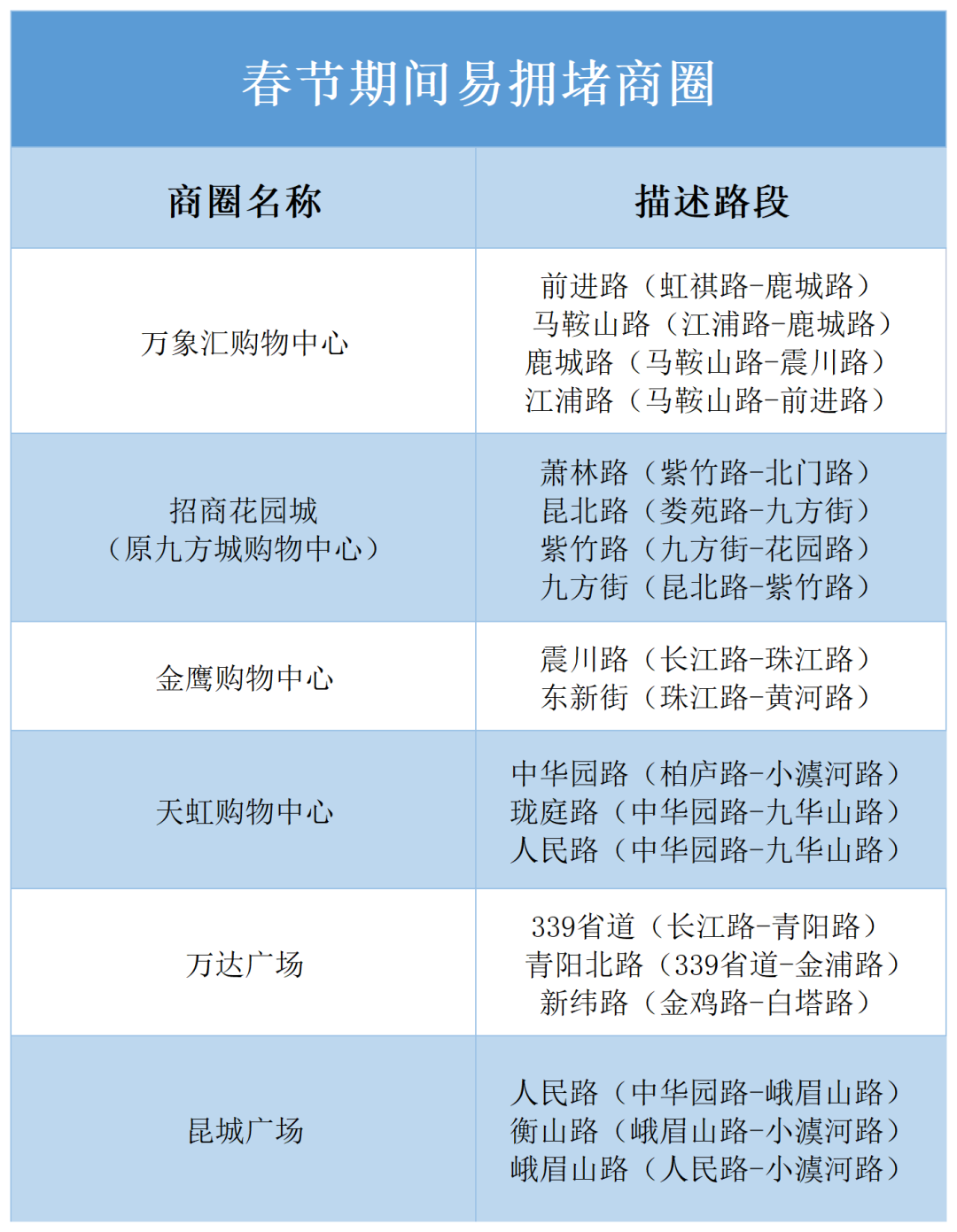 春节期间,全市交通流量整体平稳,市区交通流量较大的路段集中在天虹、世贸、万象汇、昆城、金鹰、万达、招商花园城等主要商贸区周边道路,预计流量最高峰时间段出现在日间12:00—18:00,个别商圈可能出现停车位紧缺的现象,请驾车前往的市民提前规划路线。