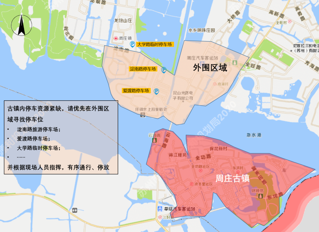 周庄古镇:预计古镇内部停车位相对紧张,古镇内部停车位饱和时,请服从现场交警指挥,行驶至古镇外围区域淀南路、爱渡路等停车场停车。