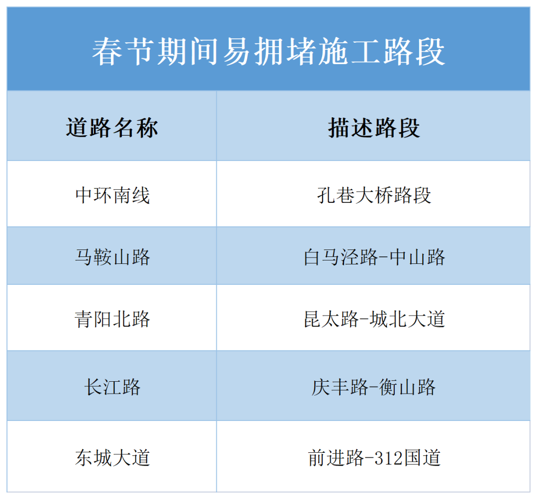 下列施工路段预计会出现短时间流量较大的情况,易引发拥堵,请提前规划好出行路线,途经拥堵路段请有序通行。