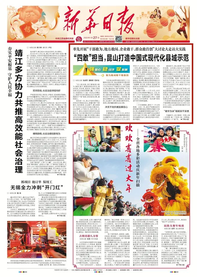 今年是全面贯彻落实党的二十大精神开局之年,是全面推进中国式现代化江苏新实践关键之年。作为承载习近平总书记“勾画现代化目标”的地方,昆山要如何以“敢”的思维、“干”的实践实现新的超越?昆山市委书记周伟说:“敢闯敢试、唯实唯干、奋斗奋进、创新创优”的新时代“昆山之路”精神与四个“敢”高度契合、一脉相承,传承弘扬精神伟力,让干部敢为、地方敢闯、企业敢干、群众敢首创蔚然成风,是昆山高质量发展的必由之路。新年伊始,昆山很忙。