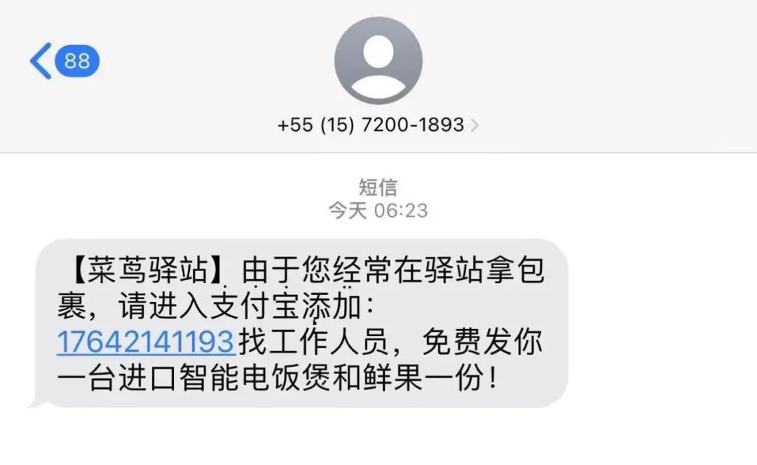 “【菜茑驿站】您好,鉴于近期您用菜鸟驿站过10次,加支付宝175xxxxxxx好友登记,可以赠送您一个智能电饭煲!”长假刚结束,市民马女士的手机上就收到了这样一条短信。马女士发现,短信中菜鸟驿站的“鸟”被写成了“茑”,因此前看到过不少跟快递相关的诈骗案新闻,让她第一时间产生了怀疑。
