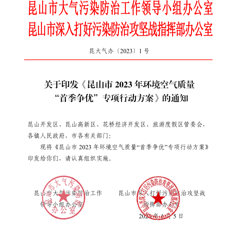 开局就是决战、起步就要冲刺。今年1月,我市大气办及污防攻坚办联合印发《昆山市2023年环境空气质量“首季争优”专项行动方案》,强化调度部署,时间上立足“早”、效率上坚持“快”、任务上务求“实”、决策上追求“准”、执法上坚决“严”,强化首季攻坚重点,全力推进首季治气关键任务,下好保卫蓝天“先手棋”。根据《行动方案》,我市从今年1月开始就逐一对接审核2023年大气污染防治工程项目,确保取得减排实效。在已排定的364个工程项目基础上再增排一批,并强化推动实施,力争3月底前完成全年工程项目30%以上。