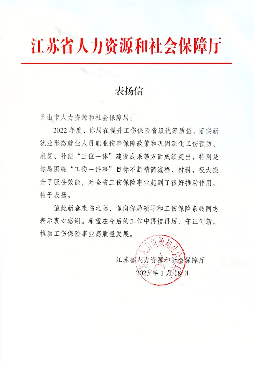 日前,市人社局收到江苏省人社厅的表扬信,信中指出“2022年度,你局在提升工伤保险省级统筹质量,落实新就业形态就业人员职业伤害保障政策和巩固深化工伤预防、康复、补偿‘三位一体’建设成果等方面成绩突出……特予表扬。”至此,市人社局工伤保险工作已连续三年受省厅通报表扬。