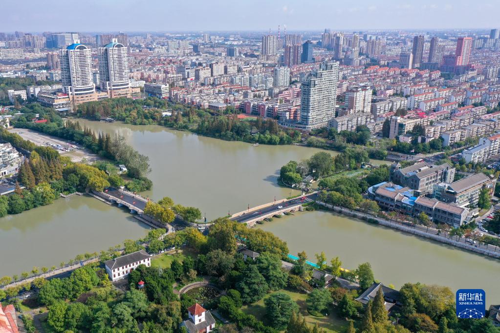 这是2021年10月25日无人机拍摄的江苏省南通市市区。新华社记者 李博 摄