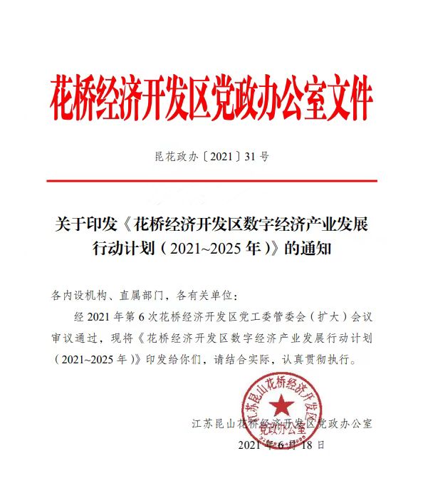 发力数字经济,花桥紧锣密鼓展开规划部署。2021年,花桥率先发布数字经济产业发展行动五年计划,聚力打造国内知名的数字经济产业创新高地。为此,花桥经济开发区成立推进数字经济和数字化发展工作领导小组和8个工作组,明确以西南片区为核心区域,聚焦数字产业化和产业数字化融合,高位推进数字经济产业园建设,全力打造千亿级数字经济产业集群。
