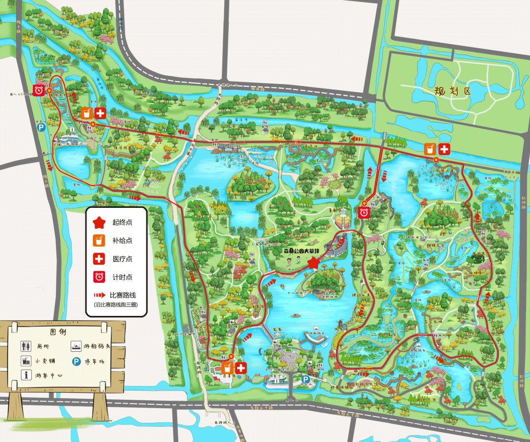 路线说明:从图中起终点出发,沿箭头逆时针跑向,单圈7公里跑3圈完成比赛
