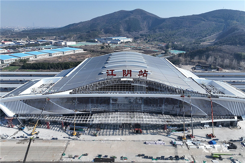 【江阴】2月27日航拍由中铁建工集团承建的南沿江铁路江阴站站房。该站房以“江尾海头、巨轮启航”为设计理念,融入江阴“河网纵横、江河交汇”的地域元素。江阴站位于江阴市城市建成区南部,建成后将实现高铁、城市轨道、公路客运等多种交通方式“无缝衔接”和“零距离”换乘。目前,江阴站已全面进入装饰装修施工阶段。本报记者 邵丹 摄