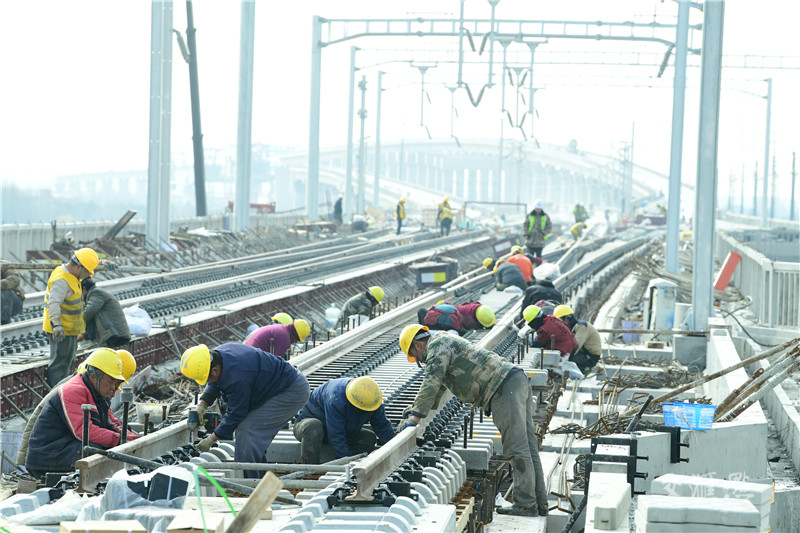 【启东】2月20日,由中铁四局承建的南通洋吕铁路主线先导段全面实现短轨通。据介绍,为有效提高轨排铺设效率,吕铁路工程1标项目部采用机铺与人工散铺相结合的方式,36小时完成轨道铺设3.045公里,为后续上砟整道、无缝线路施工创造了必要条件。许丛军 摄 视觉江苏网供图