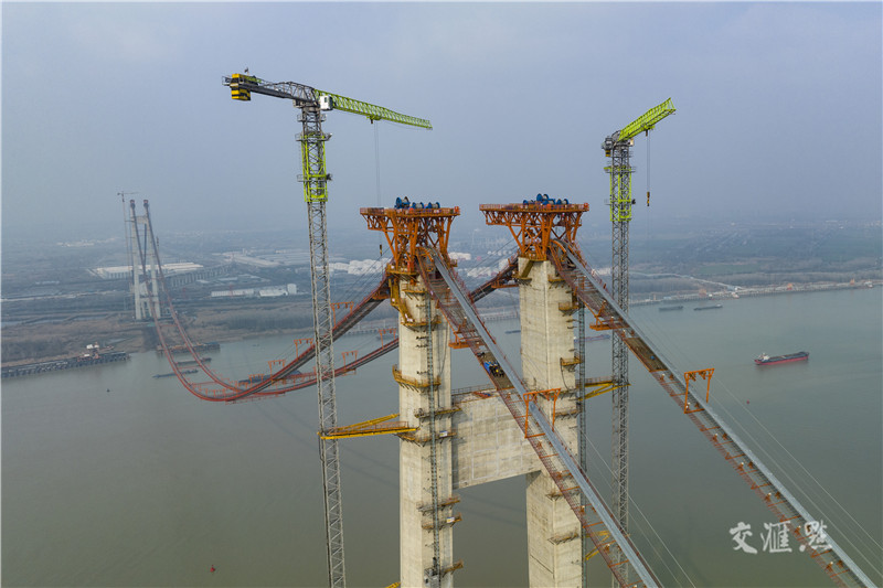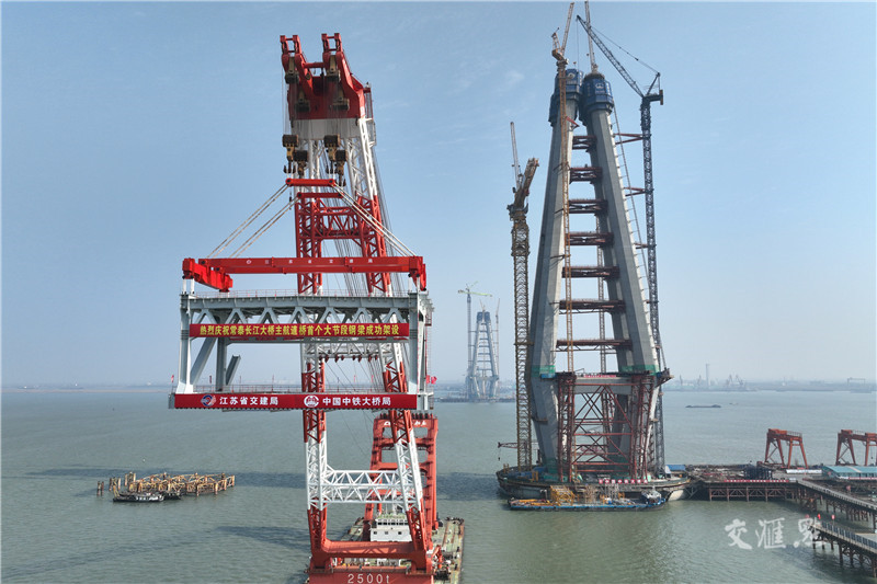 【常州】2月1日,由中铁大桥局承建的常泰长江大桥主航道桥首个大节段钢梁吊装完成,标志着大桥主航道桥钢梁架设全面展开。本次吊装的主航道桥大节段钢梁位于常州市录安洲一侧,全桥共有91个大节段,这是第一个。主航道桥钢梁架设预计将于2024年完成。陈暐 摄 视觉江苏网供图