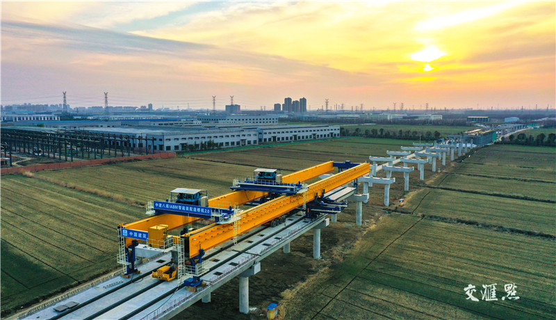 【宿迁】2月21日,在盐洛高速公路宿城至泗洪段工程一施工现场,大型智能造桥机正在安装道路上箱梁,确保项目早日完工。据了解,盐洛高速公路宿城至泗洪段全长38.18公里,总投资58.56亿元。陈玉 摄 视觉江苏网供图