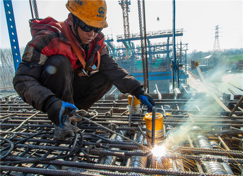 【盐城】2月20日,盐阜快速通道黄沙港特大桥工地一派繁忙景象。据了解,盐阜快速通道是204国道的重要组成部分,路线全长41.4公里,总投资约71.15亿元,主线设计时速100公里。顾枫 摄 视觉江苏网供图