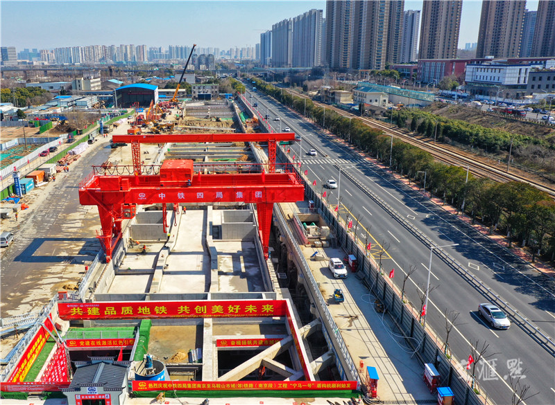 【南京】2月26日航拍宁马市域(郊)铁路(南京段)西善桥站施工现场。据了解,项目首台盾构机“宁马一号”于25日顺利始发,标志着宁马市域(郊)铁路正式开启区间盾构施工模式。宁马(南京至马鞍山)城际铁路起自南京市西善桥站,终点至马鞍山当涂南站,全线长约54.23千米。项目建成通车后,两市中心城区仅需30分钟即可实现互通互达。本报记者 赵亚玲 摄