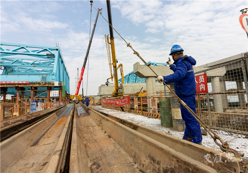 【扬州】1月15日,扬州市江都区,建设者在拆除G2京沪高速新通扬运河及跨G328大桥钢板桩围堰,为下一步安装西侧4车道的钢桁梁(钢桥)做好准备。G2京沪高速公路淮安至江都段改扩建工程项目全长110.5公里,概算总投资约138亿元,于2020年4月动工,预计将于今年6月底前建成通车。郁兴 摄 视觉江苏网供图