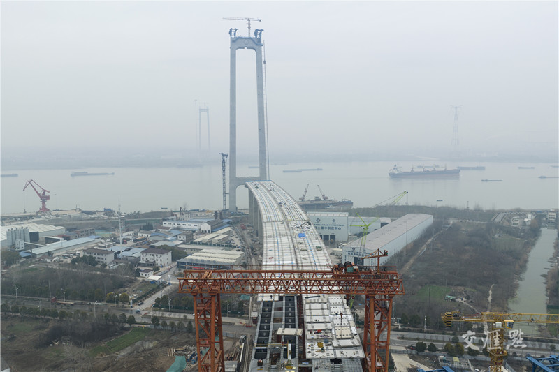 【南京】2月18日航拍龙潭长江大桥建设现场。正在建设中的龙潭长江大桥位于南京长江四桥与润扬长江大桥之间,全长4925米,预计将于2024年年底建成。颜怀峰 摄 视觉江苏网供图