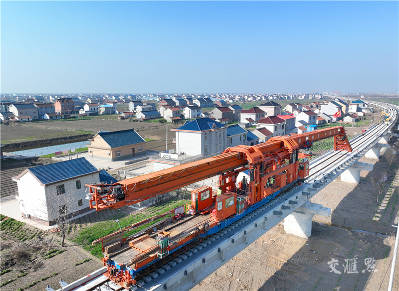 【太仓】2月27日,南沿江城际铁路太仓市站前10标施工现场,建设者正在进行无砟轨道施工。该标段4.2公里无砟轨道铺设预计将于下月完成。南沿江城际铁路设计时速350公里,新建正线全长278.53公里,线路西起南京南站、终至太仓站,全线共设8座车站,全线桥涵工程、路基工程、轨道工程已进入施工扫尾阶段。计海新 摄 视觉江苏网供图
