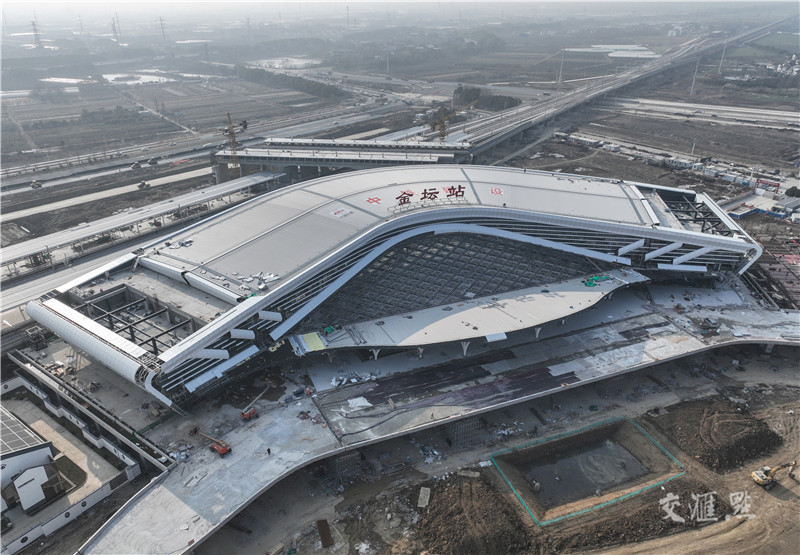 【常州】1月9日航拍由中铁建设承建的南沿江城际铁路全线唯一一座“十字交叉”共站站房——金坛站站房。据了解,南沿江城际铁路金坛站位于常州市金坛区,站台规模2台6线,站房整体以“山影、水语”作为设计语言,目前项目进入收尾阶段。邵丹 摄