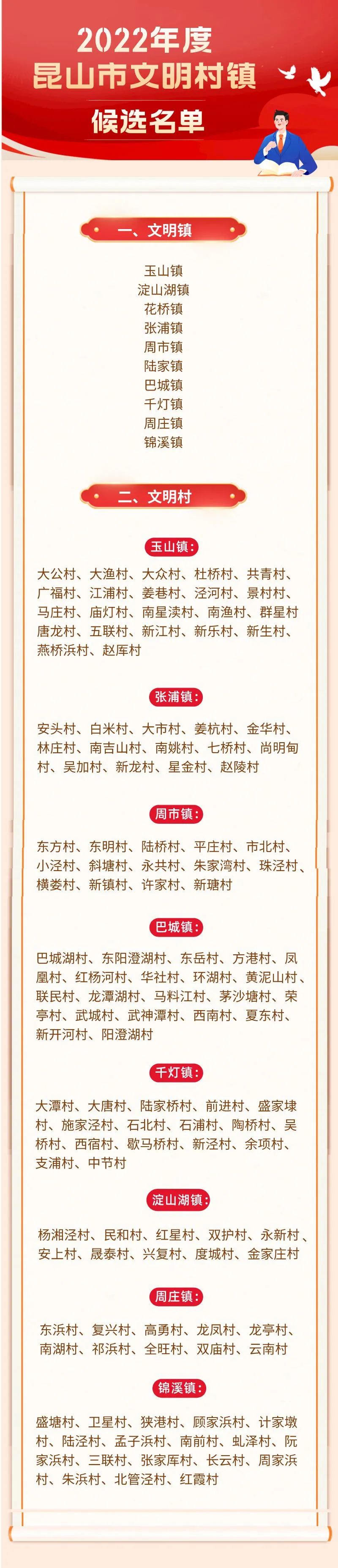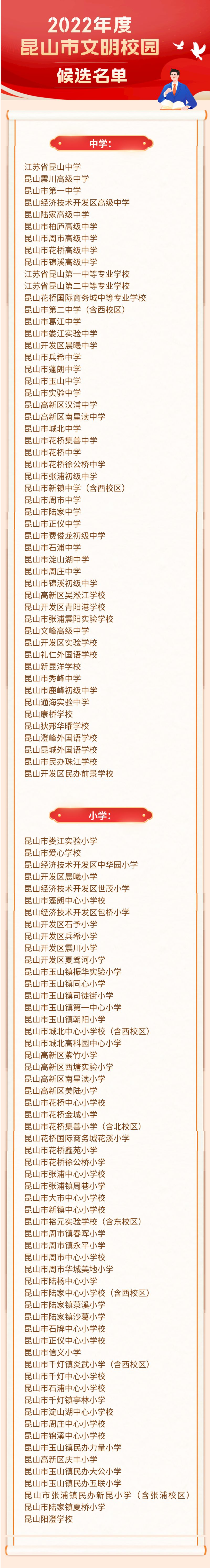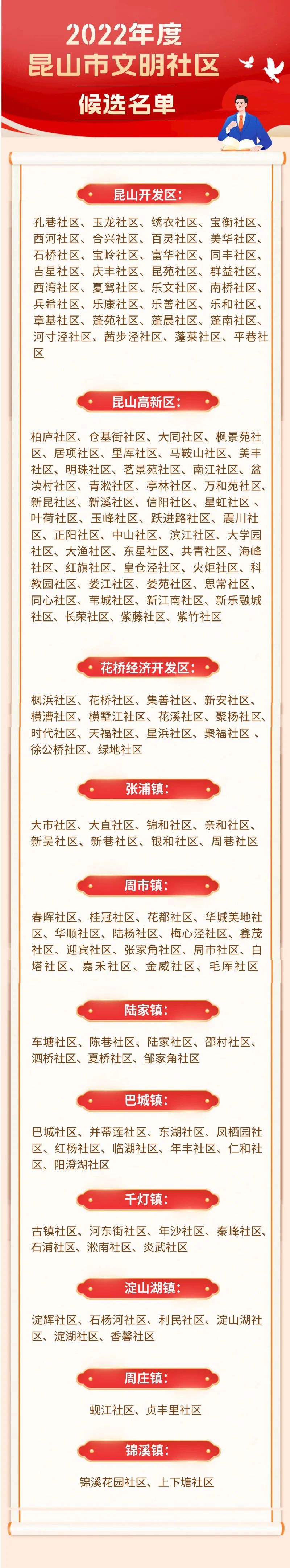为不断深化我市精神文明建设工作,巩固提升全国文明城市创建成果,常态长效开展群众性精神文明创建活动,市文明委开展了2022年度昆山市文明单位(行业)、文明镇、文明村、文明社区、文明校园评选工作,经自查申报、初评推荐、择优评选、负面清单核查,形成了2022年度昆山市文明单位(行业)、文明镇、文明村、文明社区、文明校园候选名单,现予以公示。