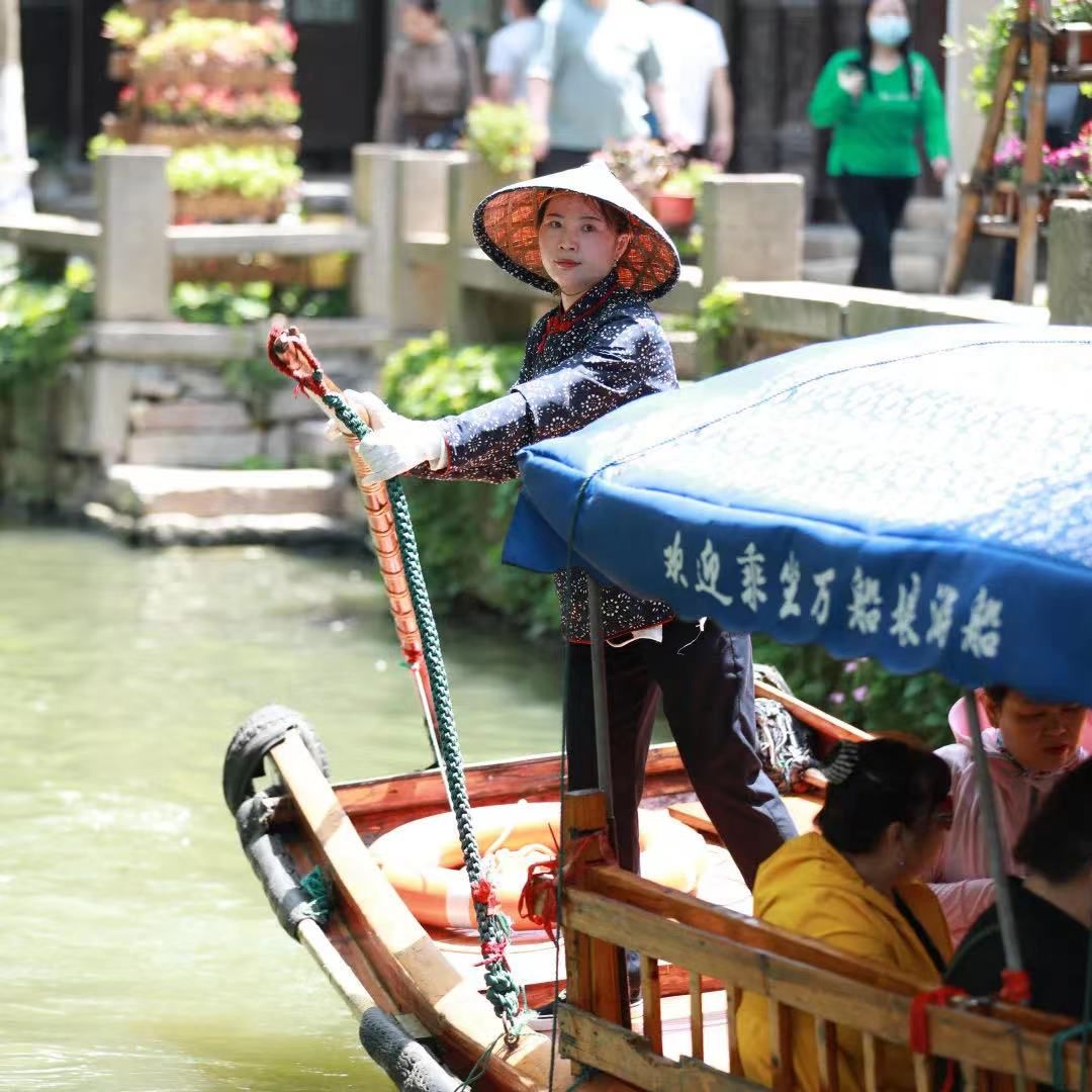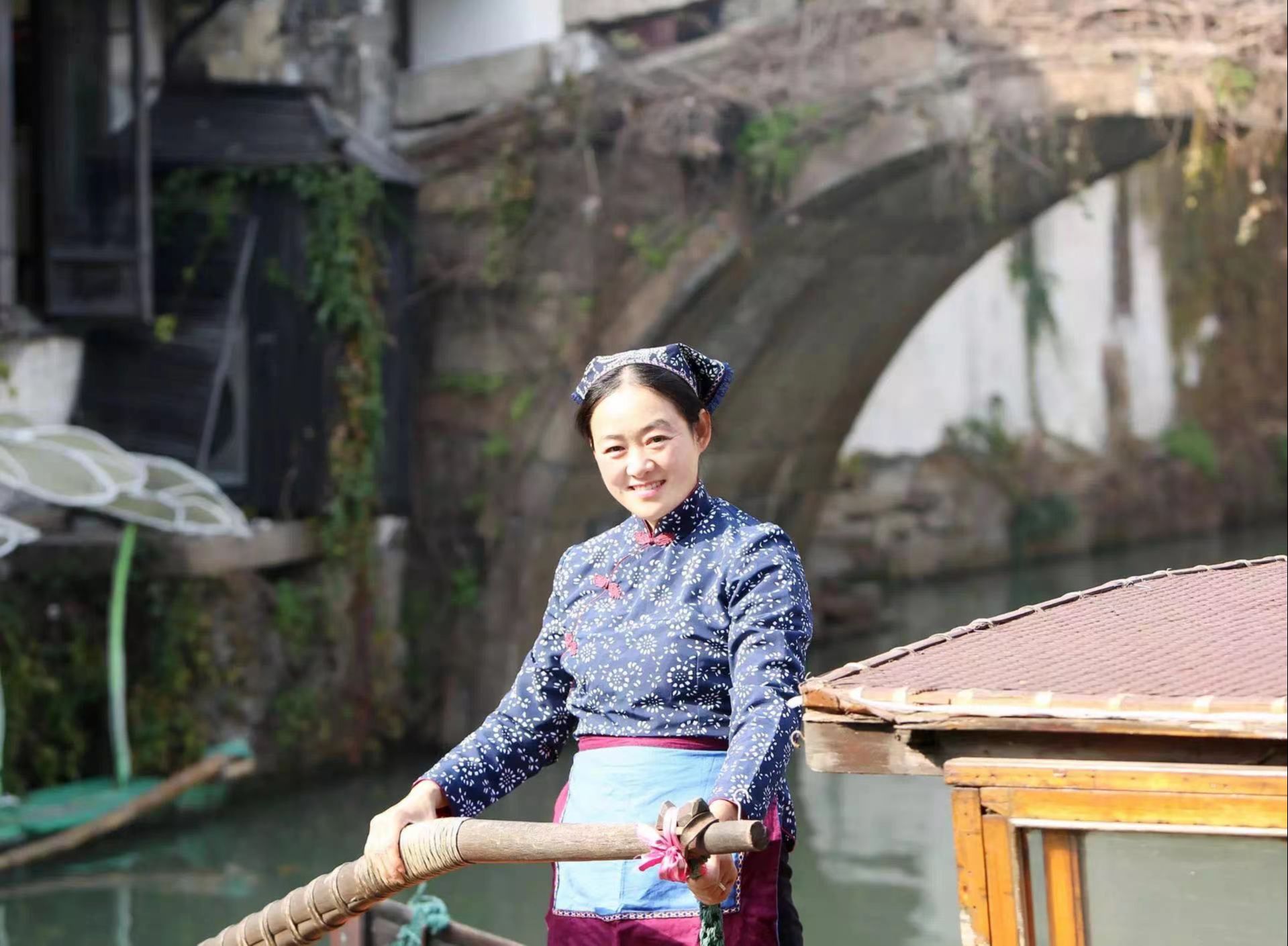 在周庄古镇,身着水乡特色服饰、摇着木橹的船娘是游客眼中一道靓丽的风景线。晃晃悠悠的小船上,船娘们唱着宛转悠扬的吴语民歌,讲着周庄本地的民间故事……作为周庄“万船娘”船队的一名文化船娘,吴娟的名气在古镇里可是响当当的。