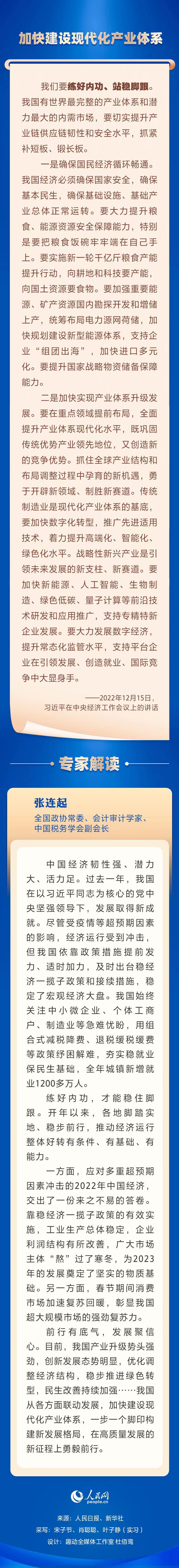 2月16日出版的第4期《求是》杂志发表中共中央总书记、国家主席、中央军委主席习近平2022年12月15日在中央经济工作会议上重要讲话的一部分《当前经济工作的几个重大问题》。围绕“加快建设现代化产业体系”,讲话指出“我们要练好内功、站稳脚跟”。人民网邀请专家进行解读。