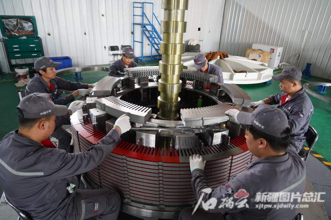 在哈密中车新能源电机有限公司,工作人员正在进行6.X兆瓦风力发电机组定子叠压工序。郭子毅 摄