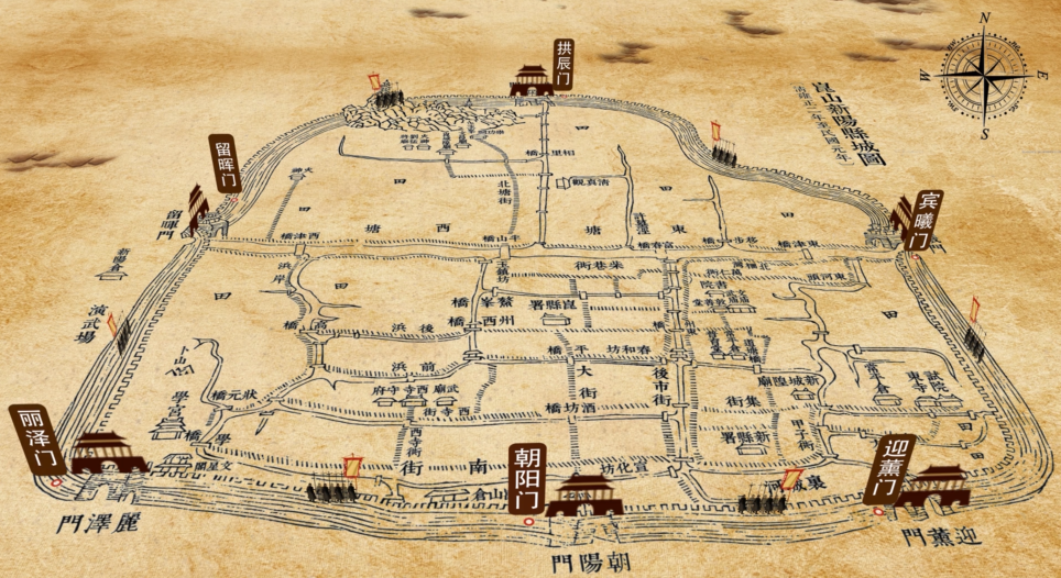 昆山古城建于江南水乡,城内有多条河流通过,百姓经常使用船只运输物品。城墙的建造者考虑到百姓生活的便利,在建设旱城门的同时还附带设有水城门,也就是水关。旱城门供车马等出入,水城门则供船只进出。比如,嘉靖年间砖城墙六个城门中的宾曦、迎薰、丽泽、留晖、拱辰等五个城门都增设有水关,形成“水陆并举”格局,因而有“六城门五水关”之说。