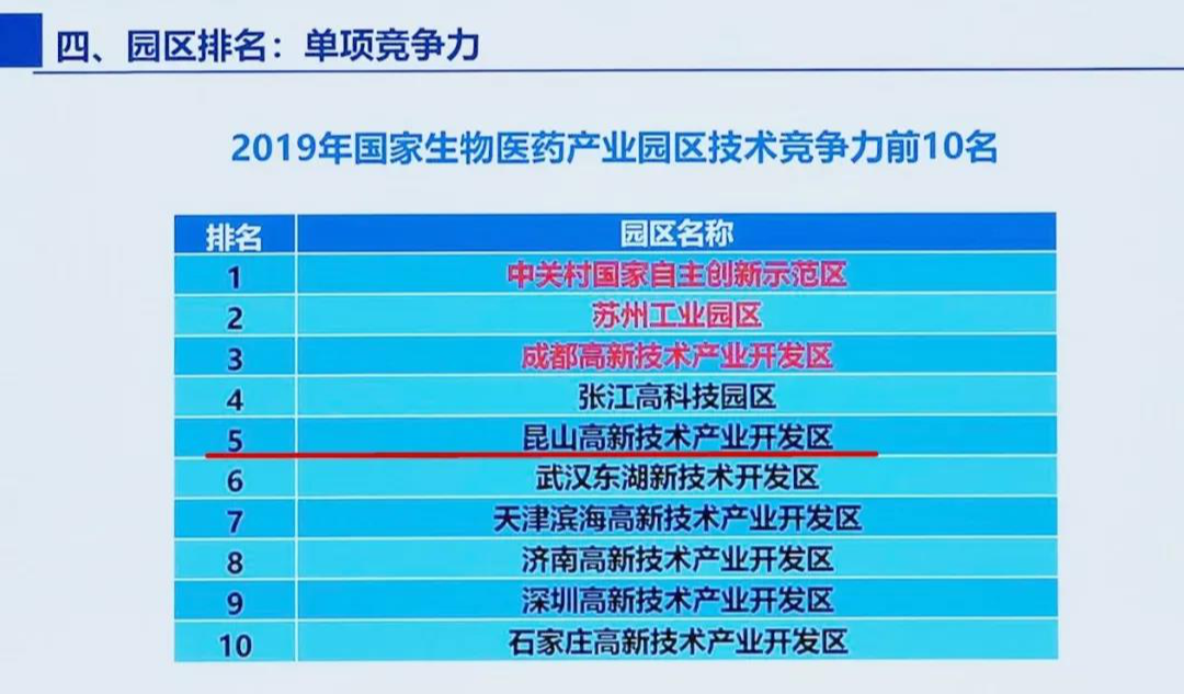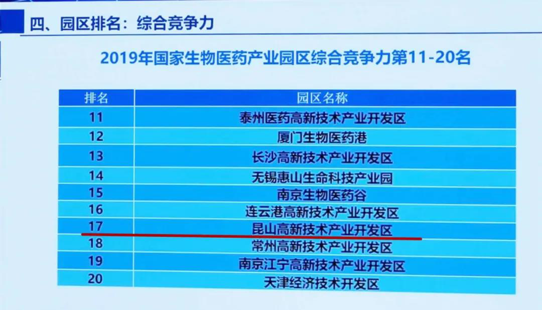 11月3日,由中国生物技术发展中心和苏州市人民政府共同主办、苏州工业园区管理委员会承办的2020中国生物技术创新大会在苏州开幕。会上正式发布了“2019年国家生物医药产业园区综合竞争力排名”,昆山高新区在全国171个园区中位列第17名,比上年度排名提升16位!此外,单项竞争力中,昆山高新区在“2019年国家生物医药产业园区技术竞争力”中位列第5名。