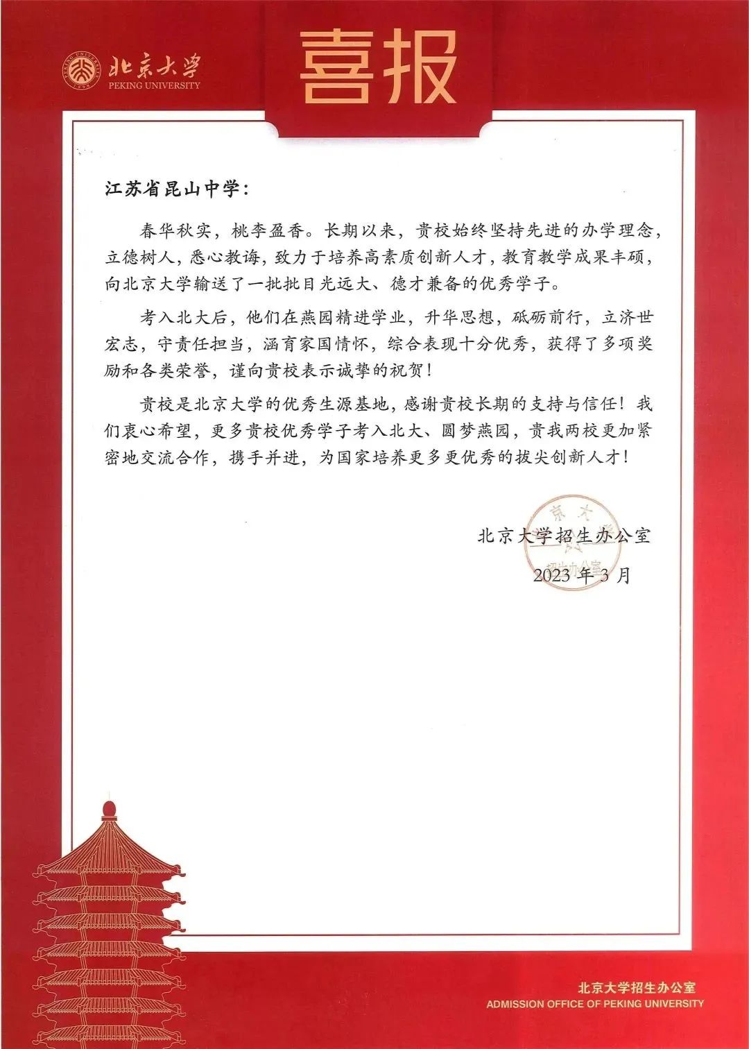 4月4日,小昆从江苏省昆山中学获悉,北京大学招生办向学校发来喜报,祝贺7位昆中毕业生在北大2021~2022学年评优评奖中获得13项荣誉,肯定昆中在教育教学上取得的丰硕成果,为北大输送一批又一批目光远大、德才兼备的优秀学子。