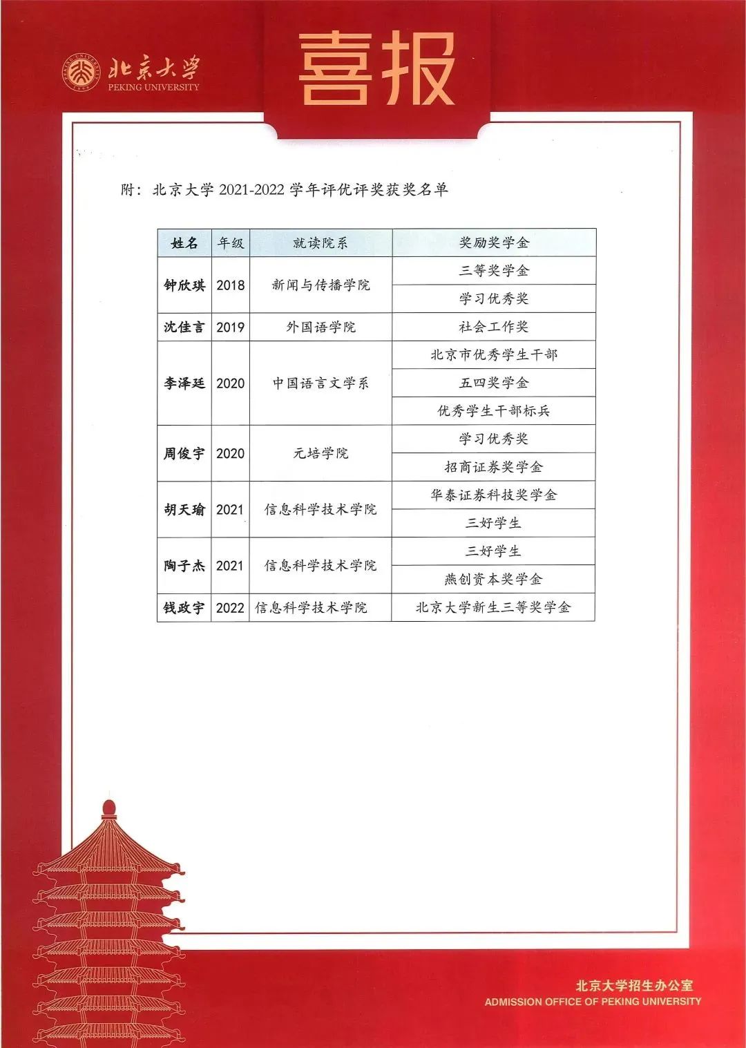 据悉,2021~2022学年,北京大学共有124位同学获此殊荣,每个院系只有极个别本科生能获此荣誉。本次7位昆中毕业生斩获的13项荣誉中,北大中文系学生会主席、昆中2020级毕业生李泽廷荣获的“北京市优秀学生干部”“五四奖学金”“优秀学生干部标兵”均是含金量极高的荣誉,其中“五四奖学金”是北京大学于1998年北大百年校庆之际设立的唯一由学校全额出资的奖学金,且恰逢五四运动100周年之际,学校还将“五四奖学金”确立为年度最高荣誉奖学金。
