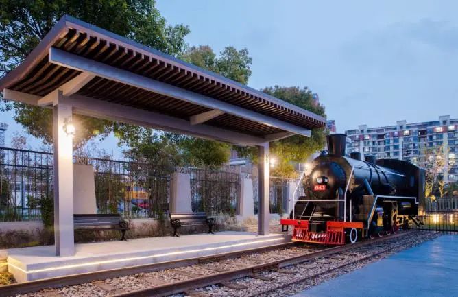 位于柏庐南路跨老铁路高架桥下,项目在建设中融入了老铁路文化元素。地面铺装采用铁轨枕木元素;在临近铁路的小广场上设计了站台形式的廊架,以满足休憩功能;而站台前是铁轨与火车头的模型,最大程度的营造铁道氛围。