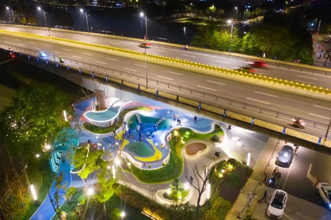位于青阳中路跨太仓塘桥下,梦幻的色调打造出“星空穹顶”,置入景观主题呼应航天发展,吸引了孩子们来进行兴趣探索,通过改造利用桥下空间挖潜城市承载力 。