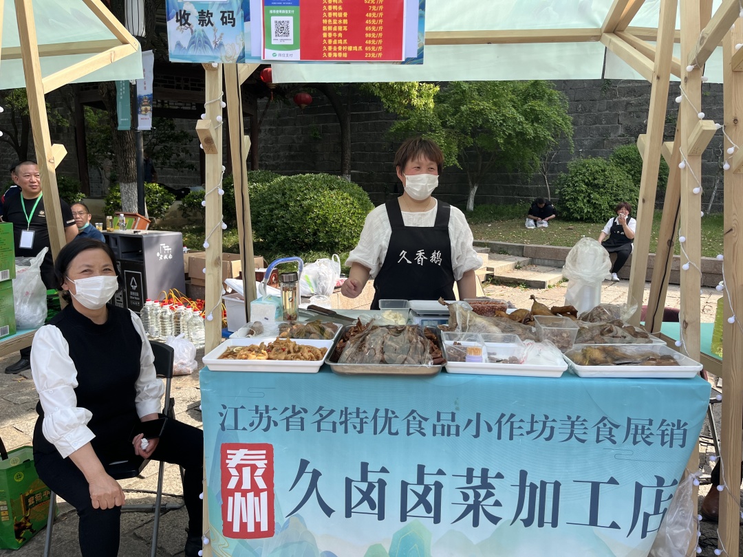 泰州的久卤卤菜加工店的摊位上,麻辣鹅、盐水鹅、蜜汁带鱼等一字排开,香气四溢。“快来尝尝,今天带来的都是‘招牌菜’!”老板陈苏琴热情地招呼。50岁的陈苏琴目前在泰州地区有十几家店,包括三四家加盟店。